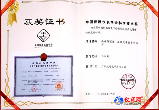 中國儀器儀表學(xué)會(huì)作為儀器儀表界學(xué)術(shù)專業(yè)的國家一級(jí)學(xué)會(huì),其頒布的科學(xué)技術(shù)獎(jiǎng)含金量很高,在整個(gè)儀器儀表及測控領(lǐng)域具有很大影響力,廣州致遠(yuǎn)電子有限公司ZDS4054Plus 以“高存儲(chǔ)深度、高捕獲率數(shù)字示波器”榮獲中國儀器儀表學(xué)會(huì)科學(xué)技術(shù)獎(jiǎng)三等獎(jiǎng)。