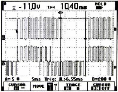 如果檢測(cè)到了這樣的情況,問題可能是出在電動(dòng)機(jī)本身或驅(qū) 動(dòng)電路。為了確認(rèn)情況,有必要檢查IGBT的輸出并和微型控 制器的輸出脈沖比較。這樣就可以體現(xiàn)190系列萬(wàn)用示波表 的隔離輸入。在普通示波器上想同時(shí)觀察這兩個(gè)信號(hào)是不可 能的,因?yàn)殡妷合嗖詈艽?。使?90系列萬(wàn)用示波表就完全 沒有問題。如圖所示,輸入端子A設(shè)置成檢測(cè)控制回路輸出 脈沖5V觸發(fā),而輸入端子B被設(shè)定測(cè)量IGBT的輸出,電壓 高達(dá)400V。從屏幕上的顯示可以清楚的看到兩個(gè)信號(hào)基于時(shí) 間的聯(lián)系,可以看出在這個(gè)例子中IGBT的輸出是正確的。