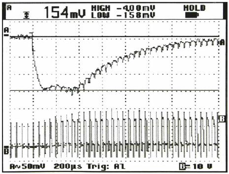 同時(shí)測(cè)量開關(guān)電源的輸出和高頻轉(zhuǎn)換器的脈沖,可以得到反饋系統(tǒng)的響應(yīng)