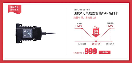 6月1日-20日 ,USBCAN-E/I-mini CAN卡直降300僅售999元,數(shù)量有限,售完即止。