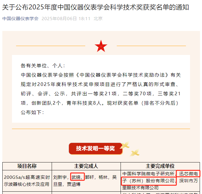 近日,蘇州迅芯微電子創(chuàng)始人武錦,在2025年度中國(guó)儀器儀表學(xué)會(huì)科學(xué)技術(shù)獎(jiǎng)評(píng)選中,榮獲一等獎(jiǎng),這是對(duì)迅芯微電子技術(shù)創(chuàng)新和產(chǎn)業(yè)貢獻(xiàn)的高度認(rèn)可。
