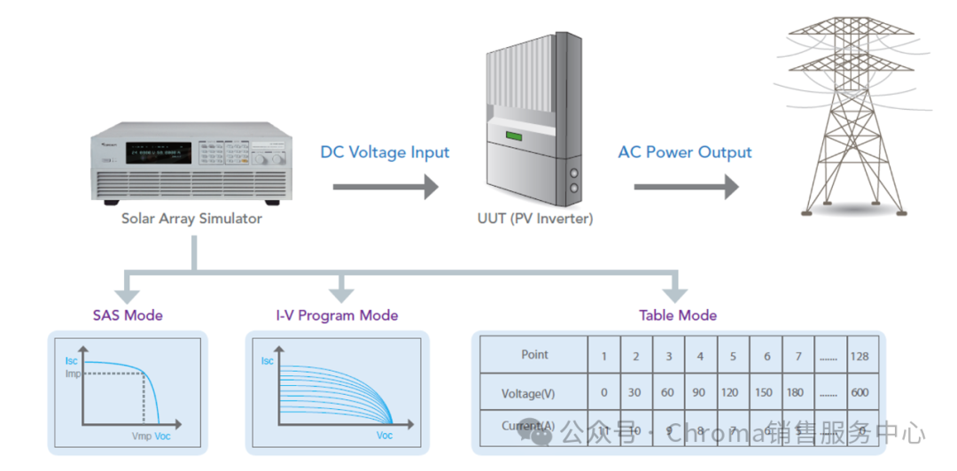 Chroma 62000H-S具有響應(yīng)快速之設(shè)計以模擬太陽電池的輸出I-V曲線,于單機(jī)內(nèi)建EN50530 & Sandia的SAS模型可簡單且方便設(shè)定Voc、Isc、Vmp及Imp等參數(shù)后產(chǎn)生一I-V曲線輸出,另外具有I-V Program功能可儲存100條不同照度及溫度下的I-V曲線于記憶體內(nèi),并且可以設(shè)定每一條I-V曲線執(zhí)行時間(1-15,000S),此外也提供一Table模式允許使用者透過數(shù)位介面存入128~4096點的V&I 陣列功能,可讓使用者編輯任何遮罩的I-V曲線,以上非常適合驗證光伏逆變器(PV Inverter)性能,此可應(yīng)用于光伏逆變器、微逆變器及太陽能充電器的最大功率追蹤(MPPT)效能測試。