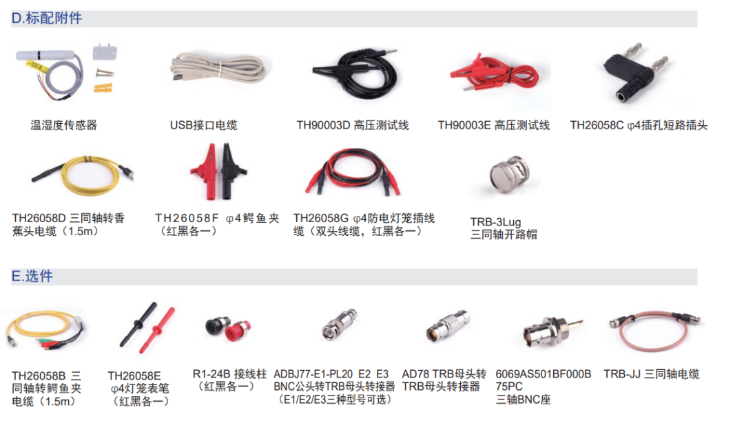 TH2690配備了多種可選附件,以配適不同的被測件,進一步提升其測試效果。主要包括電阻率測試盒和元件測試夾具。