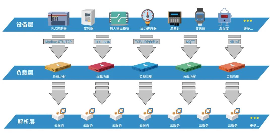 平臺(tái)集成了多種用于連接設(shè)備的通訊協(xié)議,底層協(xié)議有TCP和UDP,應(yīng)用層協(xié)議有TCPJSON、MQTT、CoAP、ModbusRTU/TCP等,每種協(xié)議都使用負(fù)載均衡技術(shù)實(shí)現(xiàn)多重容災(zāi)。支持連接的設(shè)備包括自動(dòng)化產(chǎn)品(PLC、變頻器、HMI)、數(shù)據(jù)采集與控制(模擬量輸入輸出模塊、開關(guān)量輸入輸出模塊、繼電器模塊)、儀器儀表及傳感器(壓力、流量、溫度、物位、重量)。在連接過程中使用了大量的遠(yuǎn)程終端單元(DTU、RTU)和邊緣計(jì)算網(wǎng)關(guān),還可通過平臺(tái)的協(xié)議標(biāo)簽以及腳本解析各種不規(guī)則的協(xié)議格式。