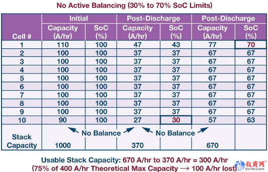電池單元間的容量或SoC不匹配可能會(huì)嚴(yán)重降低電池包可用容量,除非均衡電池單元。為使電池包容量最大化,要求在電池包充電和放電期間,電池單元是均衡的。在圖2所示的例子中,一個(gè)10單元串聯(lián)電池包由(標(biāo)稱)100 安時(shí)電池單元組成,最小容量單元與最大容量單元的容量誤差為±10%,對(duì)該電池包充電和放電,直至達(dá)到預(yù)定SoC限值。如果SoC值限制在30%和70%之間,并且不進(jìn)行均衡,則經(jīng)過一次完全充電/放電循環(huán)之后,電池包可用容量相對(duì)于理論可用容量減少25%。被動(dòng)均衡理論上可以在電池包充電階段均衡各電池單元的SoC,但在放電期間,無法阻止第10個(gè)單元先于其他單元達(dá)到30%的SoC水平。即使在電池包充電期間進(jìn)行被動(dòng)均衡,在電池包放電期間也會(huì)損失可觀的容量(不可用)。只有主動(dòng)均衡解決方案才能恢復(fù)容量,在電池包放電期間將電荷從高SoC單元重新分配給低SoC單元。
