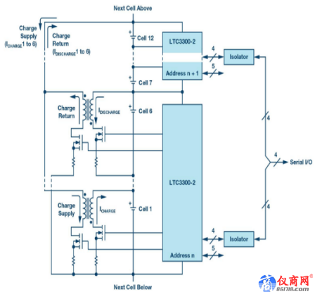 (見圖4)是專為滿足高性能主動(dòng)均衡需求而設(shè)計(jì)的新產(chǎn)品。高效率、雙向、主動(dòng)均衡控制IC LTC3300-2是高性能BMS系統(tǒng)的關(guān)鍵組成部分。每個(gè)IC可以同時(shí)均衡多達(dá)6個(gè)串聯(lián)連接的鋰離子或磷酸鐵鋰電池單元。
