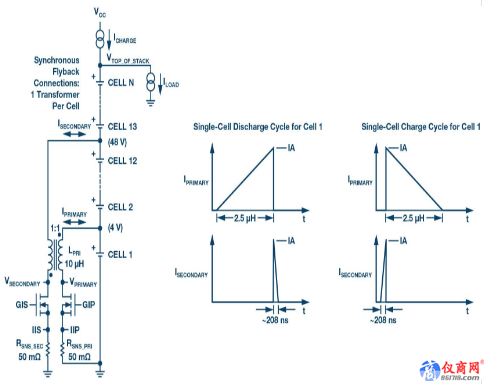 LTC3300-2中的每個(gè)均衡器都使用非隔離邊界模式同步反激式功率級(jí),以實(shí)現(xiàn)每個(gè)電池單元的高效充電和放電。6個(gè)均衡器各自都需要自己的變壓器。每個(gè)變壓器的原邊連接在要均衡的電池單元兩端,副邊連接在12個(gè)或更多的相鄰電池單元上,包括要均衡的電池單元。副邊的電池單元數(shù)量僅受外部器件的擊穿電壓限制。電池單元的充電和放電電流由外部檢測(cè)電阻結(jié)合相應(yīng)的外部開關(guān)和變壓器調(diào)整來設(shè)置,最高達(dá)到10 A以上。高效率是通過同步操作和適當(dāng)?shù)钠骷x擇來實(shí)現(xiàn)的。各均衡器通過BMS系統(tǒng)處理器使能,并且保持使能狀態(tài),直到BMS命令均衡停止或檢測(cè)到故障狀態(tài)。