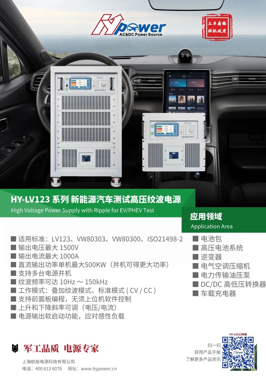 航裕電源新能源汽車高壓紋波測(cè)試解決方案,解決電動(dòng)汽車高壓部件測(cè)試難題,可通過HY-LV123新能源汽車高壓紋波測(cè)試電源,模擬電動(dòng)汽車在450VDC電力系統(tǒng)和900VDC電力系統(tǒng)下的真實(shí)電流工況、運(yùn)行環(huán)境等,測(cè)試電池包的過流保護(hù)、過載保護(hù)、長(zhǎng)時(shí)間穩(wěn)定性等各項(xiàng)功能,以檢驗(yàn)電池包的可靠性和穩(wěn)定性。