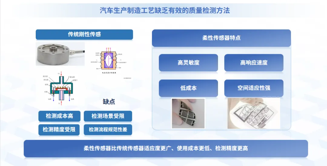 傳統(tǒng)剛性傳感器受限于制作材料的固有屬性,具有較大的硬度和脆度使其難以貼合在復雜曲面及受到較大外力容易發(fā)生斷裂和損壞,而柔性傳感器由于其輕、薄、柔、可根據(jù)使用場景定制其形狀的特點,使其能應用于各種復雜場景,可緊密貼合于各類設備,實時捕捉細微變化,為制造過程提供精準可靠的數(shù)據(jù)。在汽車工藝質(zhì)量監(jiān)測、精密設備故障診斷及智能座艙感知等領域,柔性傳感器發(fā)揮了巨大的作用,可有效應用于各類復雜場景,為汽車行業(yè)的創(chuàng)新與發(fā)展注入強大動力。