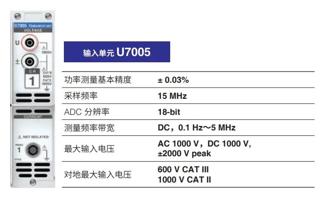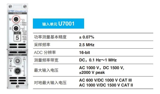 日置 PW8001 功率分析儀輸入單元 U7001 可直接輸入 AC1000V,DC1500V 的高壓,同時測量顯示電壓 (U)、電流 (I)、功率 (P)、效率 (η)、 損耗 (Loss)、諧波 (harmonic)、電壓紋波率 (Urf)、電流紋波率 (Irf) 等參數(shù)。