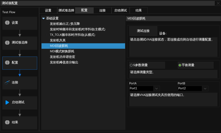該項(xiàng)測(cè)試需要用到矢量網(wǎng)絡(luò)分析儀,鼎陽的一致性測(cè)試軟件支持示波器控制矢量網(wǎng)絡(luò)分析儀進(jìn)行自動(dòng)化測(cè)試。此測(cè)試項(xiàng)主要是驗(yàn)證在MDI接口處因阻抗不連續(xù)造成的信號(hào)反射是否符合標(biāo)準(zhǔn)要求,所以測(cè)試夾具和被測(cè)樣件之間的“鏈路”的品質(zhì)對(duì)測(cè)試結(jié)果的影響很大。