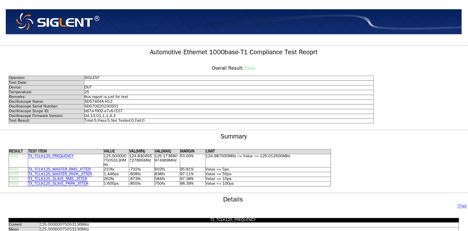 由于一致性測(cè)試要求的測(cè)試項(xiàng)目很多,在產(chǎn)品的開發(fā)調(diào)試階段,往往會(huì)更關(guān)注一些關(guān)鍵測(cè)試項(xiàng)目,如數(shù)據(jù)率、抖動(dòng)測(cè)量,SDS7000A系列示波器支持進(jìn)行單項(xiàng)測(cè)試并生成測(cè)試報(bào)告。