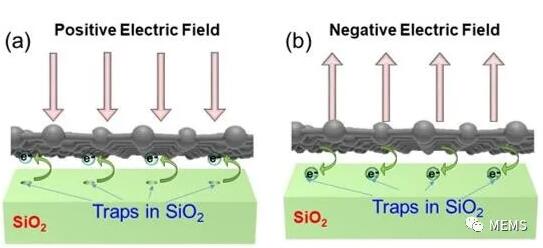 圖1 石墨烯傳感器中的電場傳感機(jī)制示意圖:(a)正電場和(b)負(fù)電場。在正電場的情況下,電子從SiO2層被吸引到石墨烯通道。相反,在負(fù)電場作用下,電子從石墨烯通道轉(zhuǎn)移到SiO2層的陷阱中。(圖片來源:JAIST)