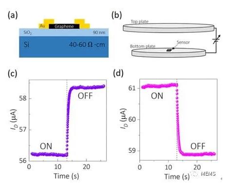 圖2(a)石墨烯器件結(jié)構(gòu)示意圖。(b)石墨烯電場測量裝置的示意圖,該裝置由兩個(gè)平行的被施加靜態(tài)電壓的金屬圓盤組成。石墨烯傳感器被放置在它們之間。石墨烯電場傳感器對(duì)(c)正電場和(d)負(fù)電場的響應(yīng)。在這兩種情況下,在平行圓盤上施加16.67 kV/m的電場。