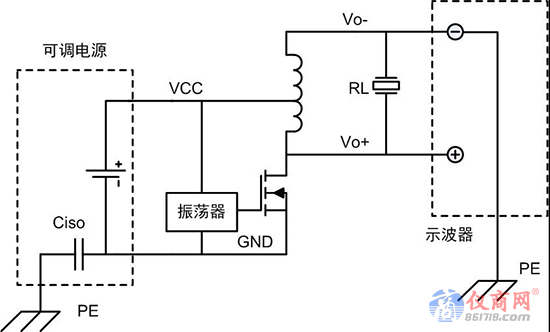 究其原因,如圖1所示,可調(diào)電源對保護(hù)接地線PE實(shí)際上存在電容,以下稱為Ciso,而示波器探頭負(fù)端是接PE的,在高頻下,探頭負(fù)端→PE→Ciso→GND形成一條低阻抗通路。電路的Vo+和Vo-對GND都存在100kHz的電壓,無論探頭負(fù)端接Vo+或Vo-,都產(chǎn)生額外的電流通過探頭負(fù)端→PE→Ciso→GND,在電感的電阻和回路電阻上產(chǎn)生熱量,使電源電流增大,另外并聯(lián)的低阻抗通道改變了驅(qū)動(dòng)器的諧振狀態(tài)。所以并非是示波器的問題,而是不正確的測量方法導(dǎo)致。