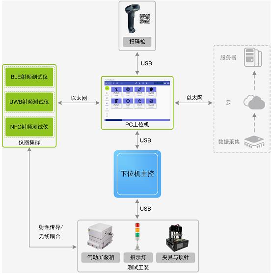 本方案主要由上位機(jī)、下位機(jī)、測試儀器、測試工裝四部分組成,各部分及其組成均采用模塊化設(shè)計(jì),為產(chǎn)品提供規(guī)范化的整套測試流程與詳細(xì)可回溯的測試結(jié)果。