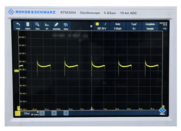 在LLC典型電路下,可以看到上管VDS信號和驅(qū)動信號的波形都非常干凈,說明RTM3004示波器的共模抑制比很好。在放大諧振電流波形之后,可以看到波形有正常的抖動,使用示波器的精確觸發(fā)功能,在諧振電流峰值觸發(fā)波形,得到相對靜止的波形。RTM3004示波器的觸發(fā)靈敏度非常高,可以在臨界點顯示相對靜止的波形,并捕捉到異常波形,為工程師正確調(diào)整電路提供參考。同時顯示Vds和諧振電流的波形,可以看到關(guān)斷瞬間諧振電流的波形。