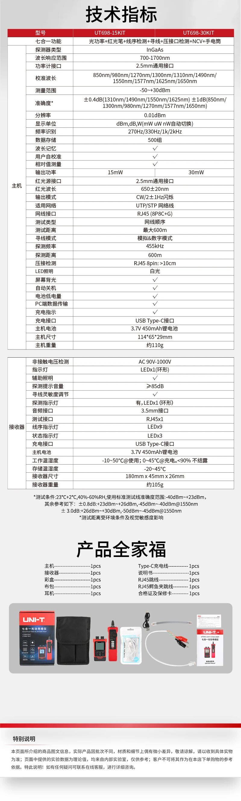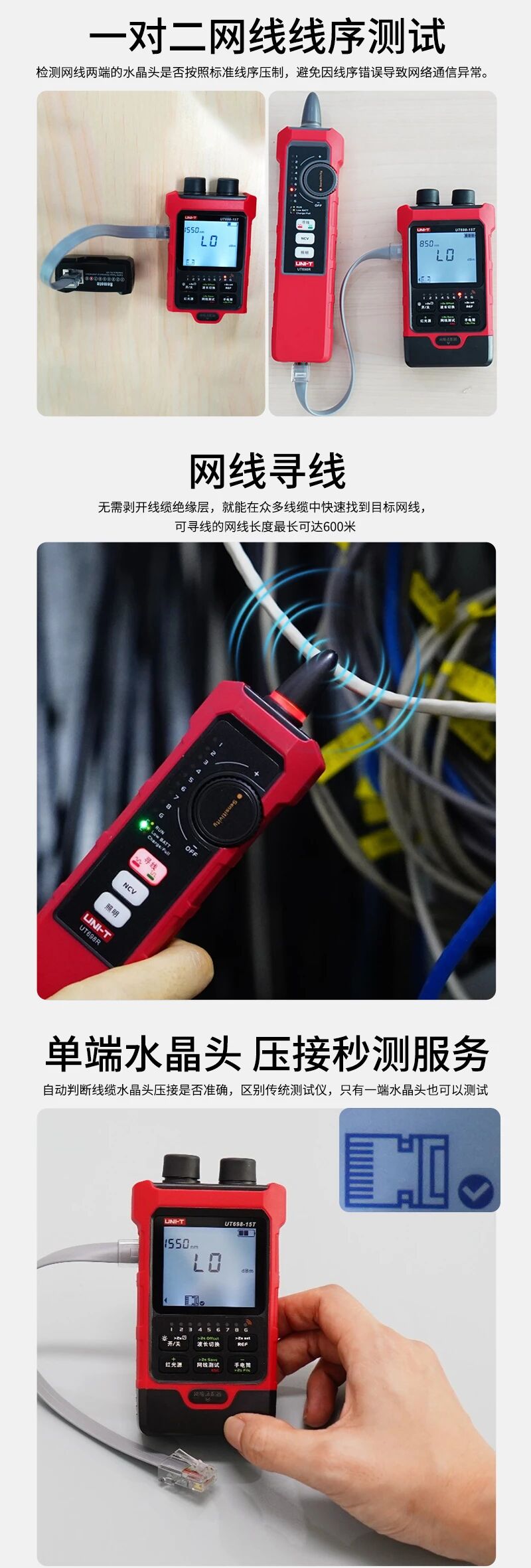 在現(xiàn)代通信與網(wǎng)絡維護工作中,工程師和技術人員往往需要攜帶多種工具,來應對光纖與銅纜的安裝、調試及故障排查。優(yōu)利德推出的UT698系列七合一光功尋線儀,將光功率測量、紅光尋斷點、NCV檢測、網(wǎng)線尋線、網(wǎng)絡對線、水晶頭壓接檢測以及手電筒七大核心功能融合于一身,大大簡化了現(xiàn)場操作流程,提升了工作效率,真正實現(xiàn)“一機在手,網(wǎng)絡無憂”。