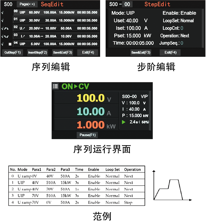 列表測試模式下,用戶可以設(shè)置一系列電壓或電壓變化值、電流或電流變化值、功率等級、操作模式、持續(xù)時(shí)間以及其他參數(shù)。該系列可按照定義的步驟自動輸出這些設(shè)定值,從而更好地支持自動測試、老化等應(yīng)用場景。