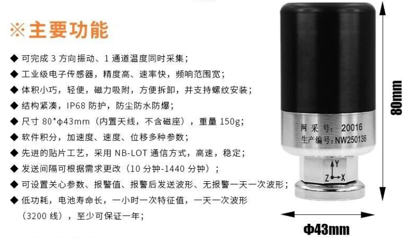 該傳感器內(nèi)置NB-IoT通信模塊,基于電信云平臺運行,用戶可通過多個客戶端或手機(jī)APP實時查看設(shè)備狀態(tài)數(shù)據(jù)。發(fā)送間隔可根據(jù)實際需求靈活設(shè)置(10分鐘至1440分鐘),支持自定義報警閾值及波形觸發(fā)機(jī)制,兼顧實時性與低功耗需求。