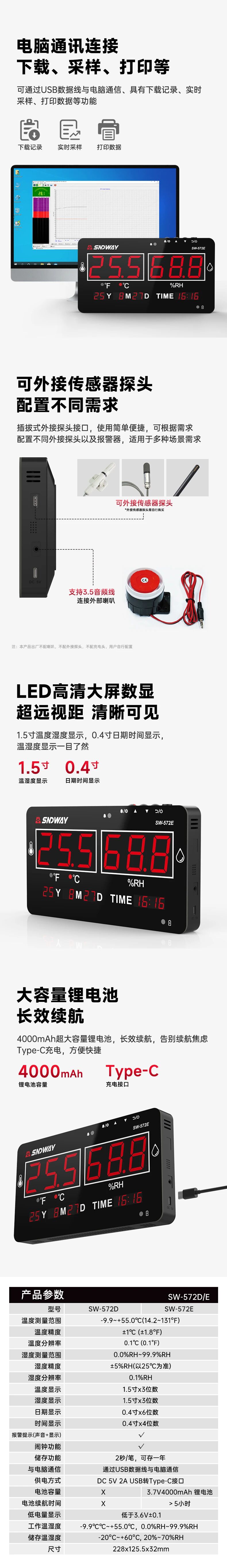 在功能方面,SW-572E支持用戶自定義溫濕度報(bào)警上下限,超出設(shè)定范圍時(shí)可觸發(fā)聲光報(bào)警。設(shè)備具備自動(dòng)數(shù)據(jù)存儲(chǔ)能力,每2秒記錄一次數(shù)據(jù),最多可連續(xù)存儲(chǔ)一年。通過USB Type-C接口,用戶可連接電腦進(jìn)行數(shù)據(jù)下載、實(shí)時(shí)采樣或打印,也可外接傳感器探頭及報(bào)警器,擴(kuò)展監(jiān)測(cè)場(chǎng)景。