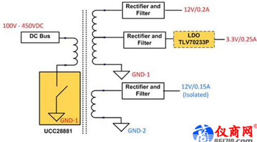AC/DC電源的1W輔助電源(100V-450VDC,5W,80%效率)參考設計是一個具有多輸出電壓的緊密5W寬高壓直流輸入輔助電源。